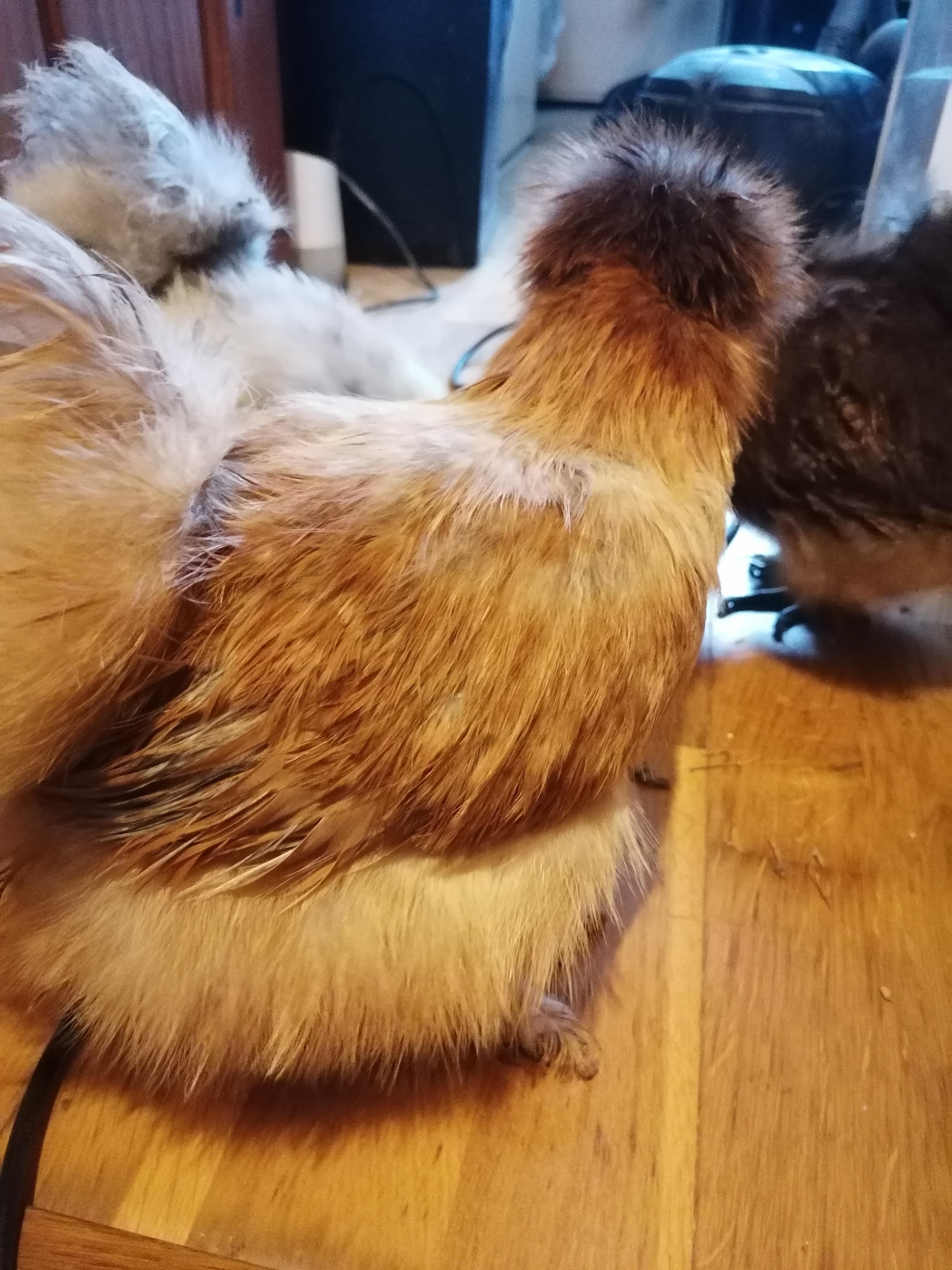This hen is a good broody, as they fall broody often during the year. So much so that they might rarely been seen out of the nestbox. Silkie cockerels are somewhat defensive simply because of their poor visibility. They are always on their guard. A trim tends to sort this behaviour, as once they can see properly they know what they are up against.